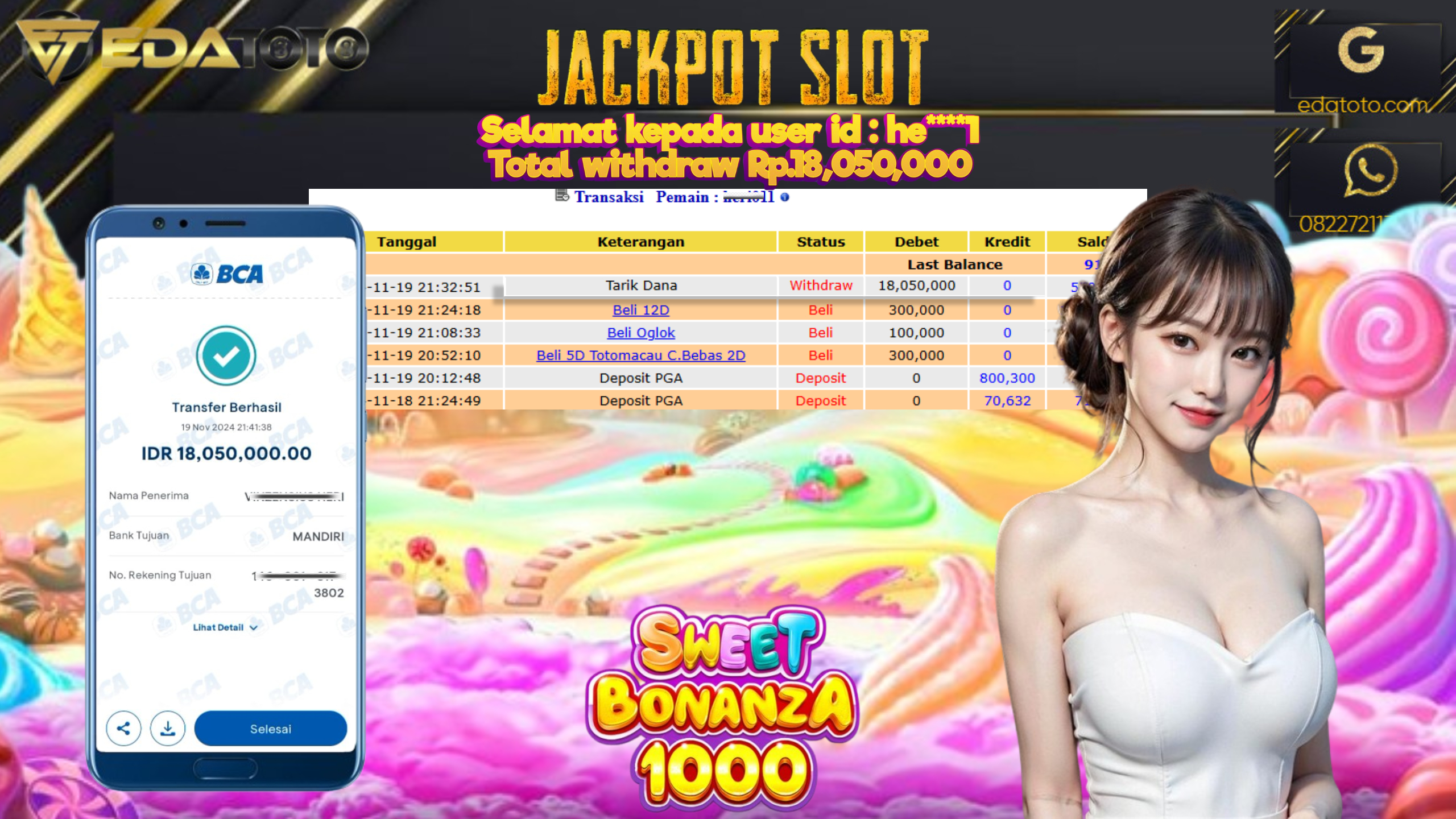 Selamat Kepada Pemilik user ID : by****qx00 Hari/Tanggal : Jumat/ 18 NOVEMBER 2024 Jackpot : Rp. 19.000.000 JT Permainan : . . .