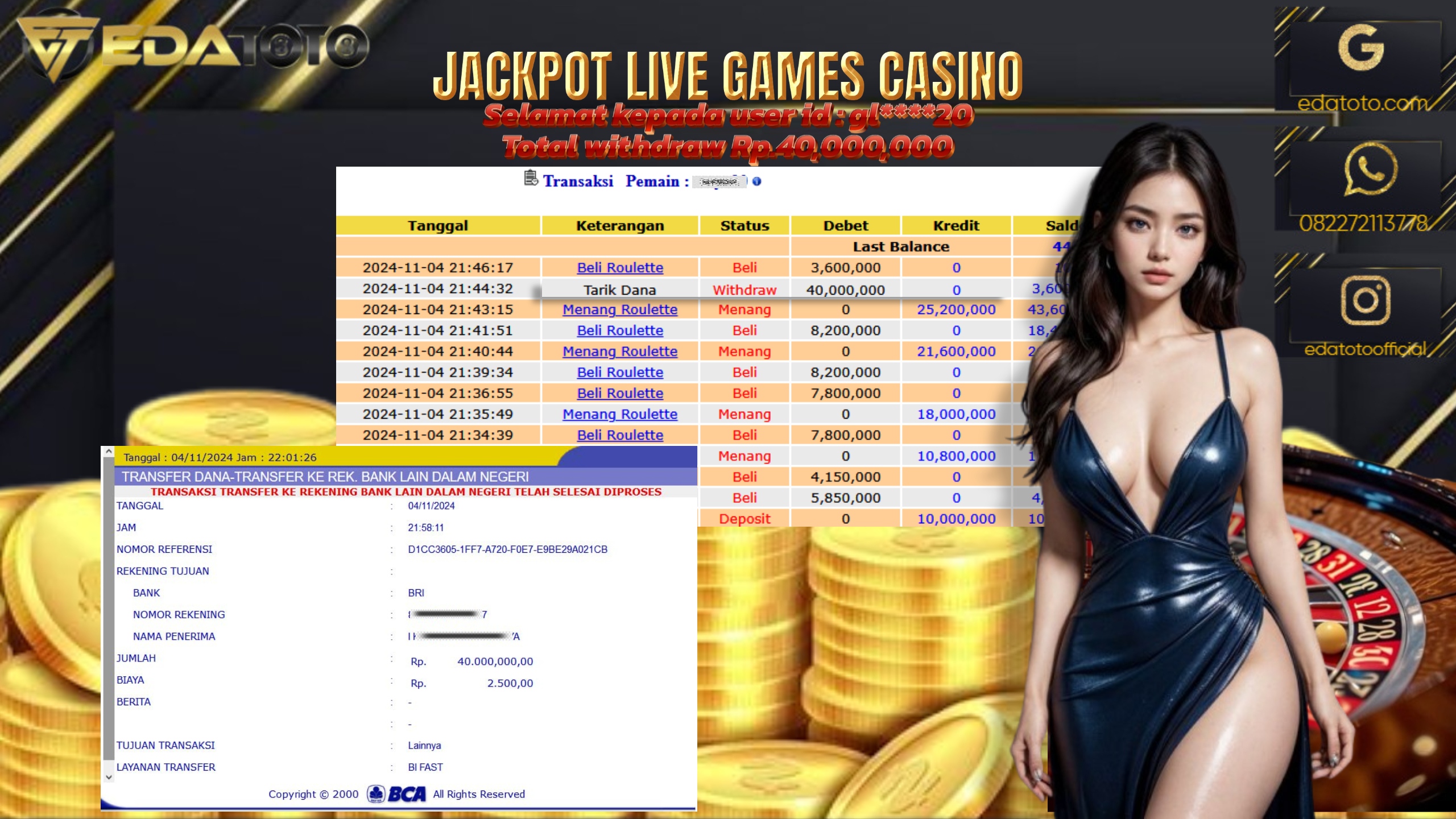 Selamat Kepada Pemilik user ID : gl***20 Hari/Tanggal : Jumat/ 04 NOVEMBER 2024 Jackpot : Rp. 40.000.000 JT Permainan : . . .